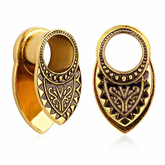ボヘミアンなデザインのシールドエンブレムを金色のフレアにデザインした個性的なホール系ボディピアス。両側に大きなシールドをセットしているのでホールに余裕がないと装着は難しい。メンズでもレディースでも使えるインディアンジュエリーモチーフのボディーピアス。プレゼントにも最適!個性を発揮できる面白いボディーピアス。