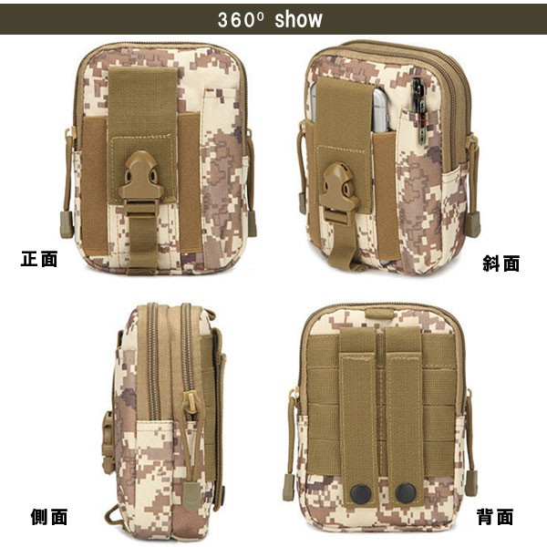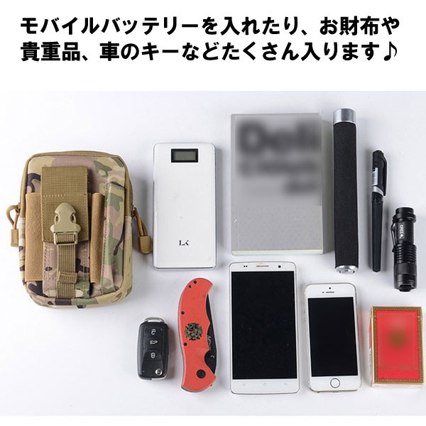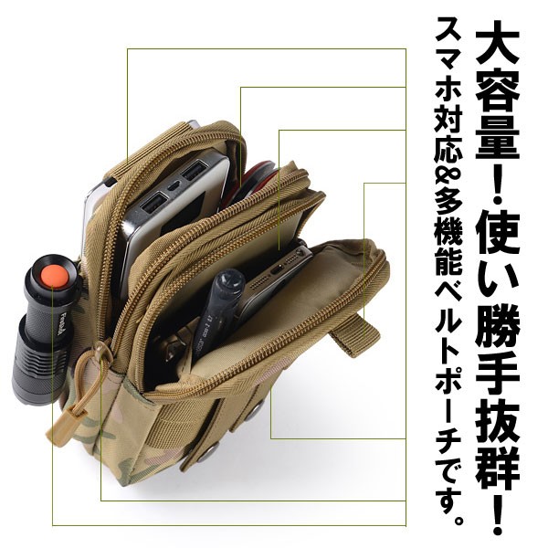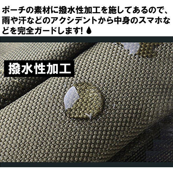 スリムな外見ながら大容量で、スマートフォンはもちろんアウトドアに便利なライト等もたっぷり収納できます!モバイルバッテリーを入れたり、お財布や貴重品、車のキーなどたくさん入ります♪メイン収納部分はジップ付きで安心◎高品質なファスナーを使用し、動作も快適です。お使いのベルトを通して腰の部分に装着し、丈夫な構造で簡単に外れることはありません。カラビナなどを使えばバックパックに吊るすこともできるので、使い方は様々!ポーチの素材に撥水性加工を施してあるので、雨や汗などのアクシデントから中身のスマホなどを完全ガードします☆迷彩柄など10つのデザインからお選びいただけます。男女兼用! ※カラビナは付属しません。