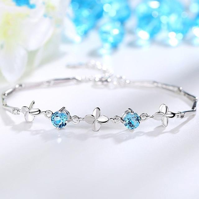 ブレスレット レディース 2粒ダイヤ 四つ葉のクローバー 2色 クリア ブルー モチーフ プラチナ仕上げ シルバー925 彼女 妻 女性 人気 プレゼント