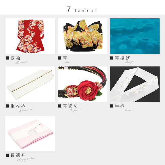 内容は【振袖・帯・帯揚げ・伊達衿(重ね衿)・帯締め・半衿・長襦袢】の7点セットです。