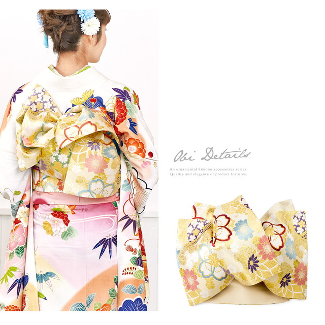六通柄の袋帯は京都西陣織証紙番号2291『志都香』謹製で、華やかな金色糸が煌めく手鞠に、桜が表現された高級感ある意匠です。