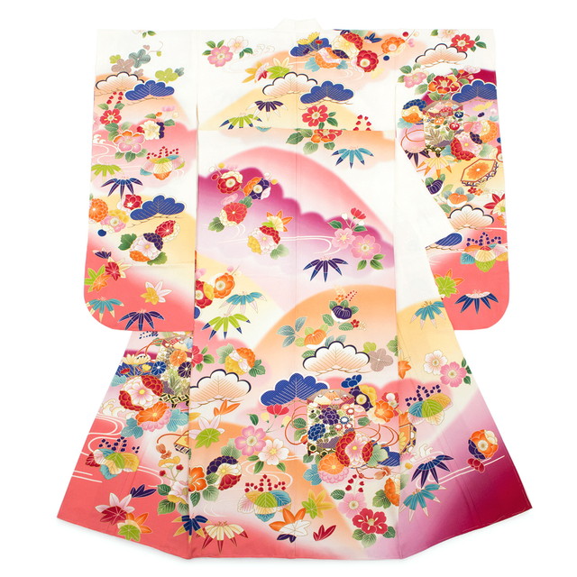 振袖は桜紗綾型の織柄の正絹生地に、華やかな貝桶や流水、色鮮やかな山々に、菊や桜、松竹梅に桐が豪華な絵羽模様です。