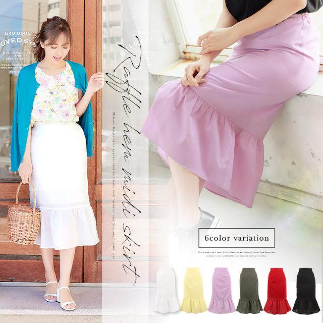 春新作 着映え力満点の主役級アイテム!ラッフルヘムミディ丈スカート/ M2083 入荷済 レディース スカート ミモレ丈 マーメイド フリル マーメイドスカート タイト タイトスカート 40代 50代