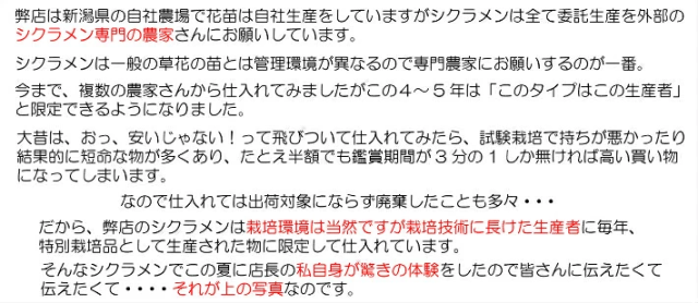 ■ホルモン剤を使わずシクラメン本来の力を最大限に発揮する生産方法でたくさんの花を立ち上げます。