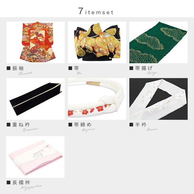 内容は【振袖・帯・帯揚げ・伊達衿(重ね衿)・帯締め・半衿・長襦袢】の7点セットです。