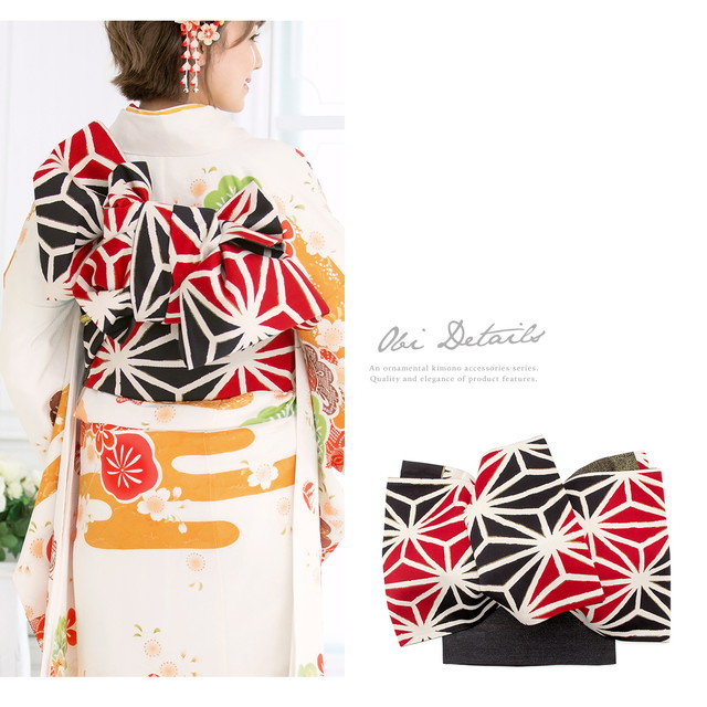 六通柄の袋帯は、金色糸で縁取られた麻の葉のモダンで高級感ある意匠です。