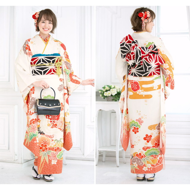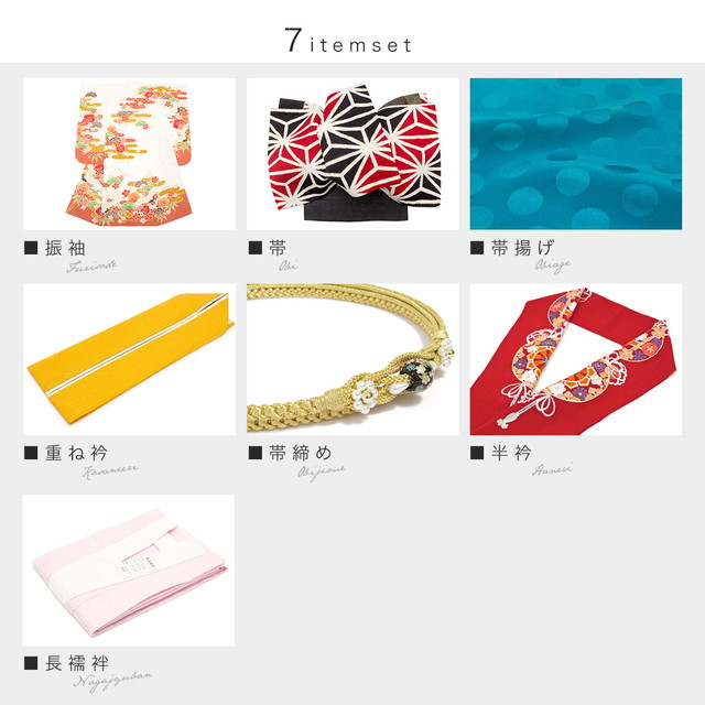 内容は【振袖・帯・帯揚げ・伊達衿(重ね衿)・帯締め・半衿・長襦袢】の7点セットです。