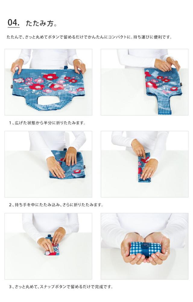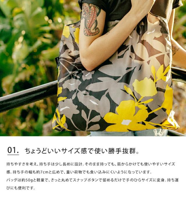 持ちやすさを考え、持ち手は少し長めに設計。そのまま持っても、肩からかけても使いやすいサイズ感。持ち手の幅も約7cmと広めで、重い荷物でも食い込みにくいようになっています。バッグは約50gと軽量で、さっと丸めてスナップボタンで留めるだけで手のひらサイズに変身。持ち運びにも便利です。