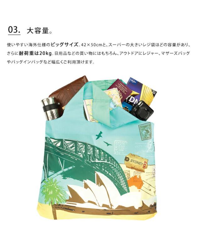 また、使いやすい海外仕様のビッグサイズ。42×50cmと、スーパーの大きいレジ袋ほどの容量があり、さらに耐荷重は20kg。日用品などの買い物にはもちろん、アウトドアにレジャー、マザーズバッグやバッグインバッグなど幅広くご利用頂けます。