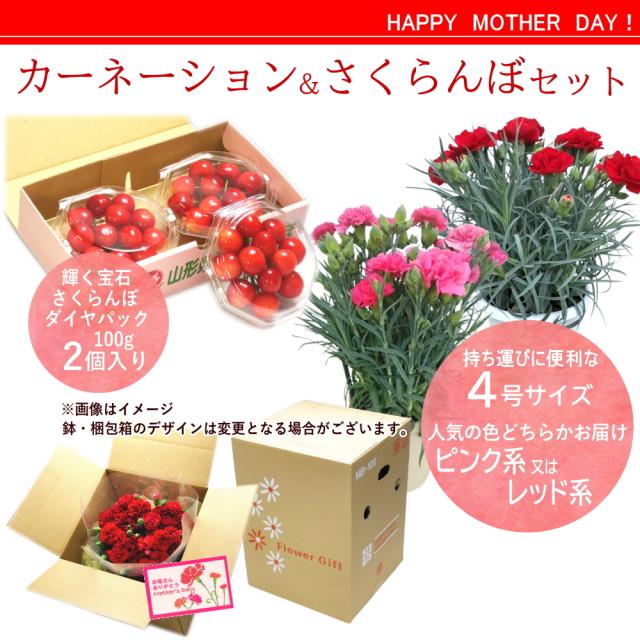 母の日ギフトに定番のカーネーション鉢植えと山形産さくらんぼをダィヤパックに詰めてセットでお届け致します。