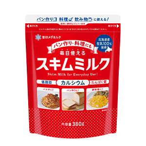 パン作り、料理、飲み物に使える!北海道産生乳を100%使用した毎日使えるスキムミルク。たっぷり使える大容量380g。保存に便利なジッパー付き。いつものレシピにちょい足しするだけで、味の変化はほとんどなくコクと栄養をプラスできます。乳脂肪がほとんど含まれていないため、脂質を気にせずカルシウムやたんぱく質をしっかり摂ることができます。(100gあたり/たんぱく質:36.3g、脂質:0.7g、糖質:51.5g、カルシウム:1200mg※雪印メグミルク調べ)【内容量:380g/普通便】