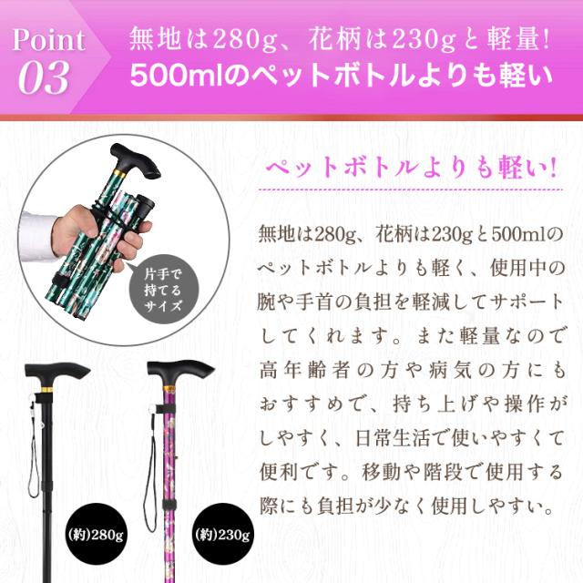 (約)230g〜280gとどんな人でも軽量で持ちやすいおりたたみステッキです