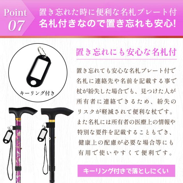 置き忘れても安心な名札付きで、名札に連絡先や名前を記載する事で杖が紛失した場合でも安心です