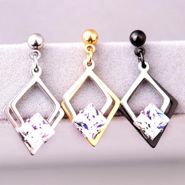 ひし形のモチーフに大きなクリスタルのジルコニアをセットしたバーベル型ボディピアス。カラーもシルバー、ブラック、ゴールドから選べるボディーピアス。メンズでもレディースでも使えるおしゃれなバーベルはヘリックスやトラガス、耳たぶなどいろいろな場所で大活躍できるアイテムです。メンズでもレディースでも使えるおしゃれなボディピはペアやプレゼントにも最適です。