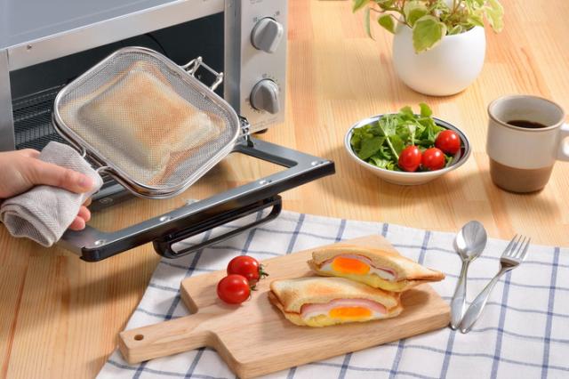 本体を開いてパン、具材、パンの順にのせ、本体を閉じてロック。後は魚焼きグリルに入れて4分程度焼くだけ。