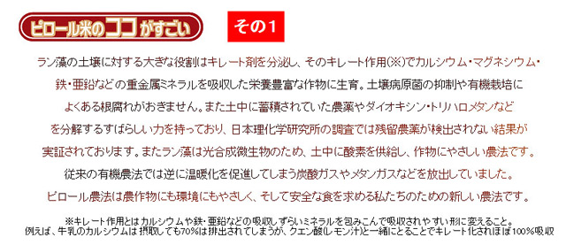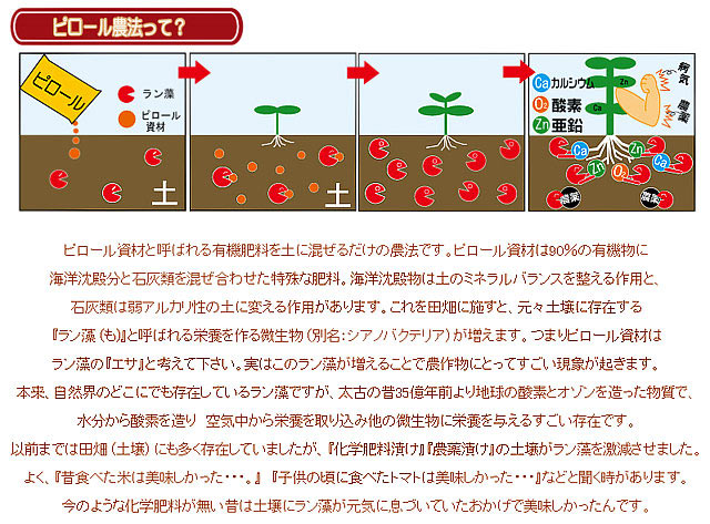 ピロール肥料はシアノバクテリア(通称:らん藻)を増殖させ、土中の酸素濃度を増やし、根を強く大きく育ちます。またキレート作用でカルシウム・マグネシウム・鉄・亜鉛を分泌し栄養価の高い甘みのある美味しい作物になります。またらん藻は土中のダイオキシン・トリハロメタン・農薬を分解する働きを持ち農薬の心配の無い安全な作物を育たせます。