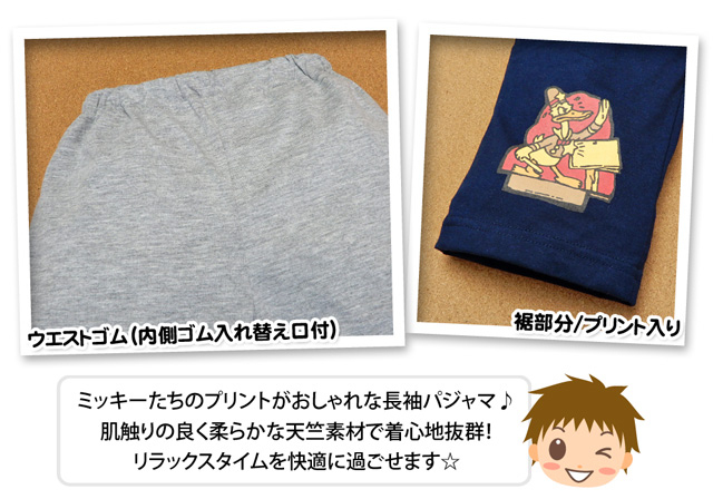 | コメント | ミッキーたちのプリントがおしゃれな長袖パジャマ♪肌触りの良く柔らかな天竺素材で着心地抜群!リラックスタイムを快適に過ごせます☆ |