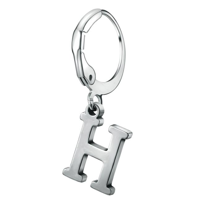 細身のレバーバックタイプのリングピアスに英語のアルファベットのH(エッチ)のチャームが揺れるステンレスピアス。