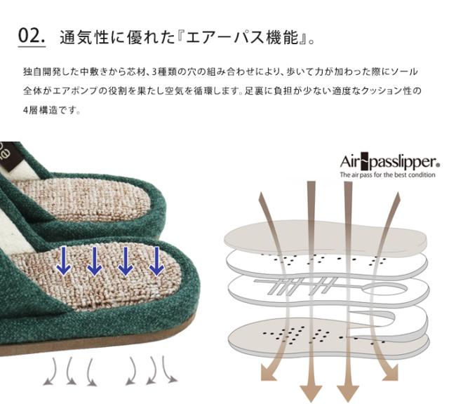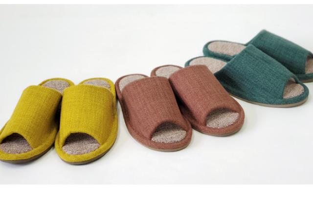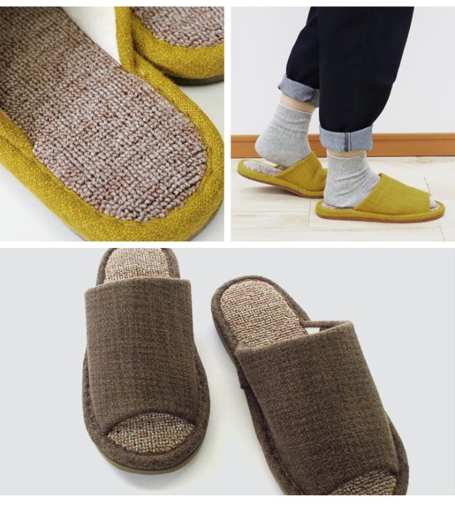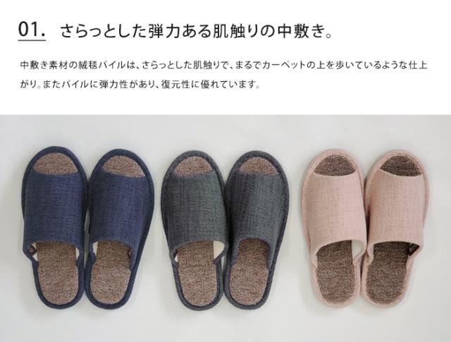 中敷き素材の絨毯パイルは、さらっとした肌触りで、まるでカーペットの上を歩いているような仕上がり。またパイルに弾力性があり、復元性に優れています。独自開発した中敷きから芯材、3種類の穴の組み合わせにより、歩いて力が加わった際にソール全体がエアポンプの役割を果たし空気を循環します。足裏に負担が少ない適度なクッション性の4層構造。人と素材の関わりをデザインしたスリッパ、ecru(エクリュ)は、販売開始より10年以上愛されています。