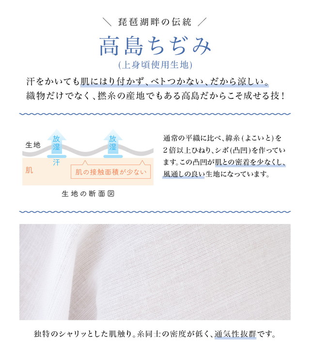 高島ちぢみは汗をよく吸い、早く乾く性質を持っているため暑い夏でも涼しく快適に過ごせます。