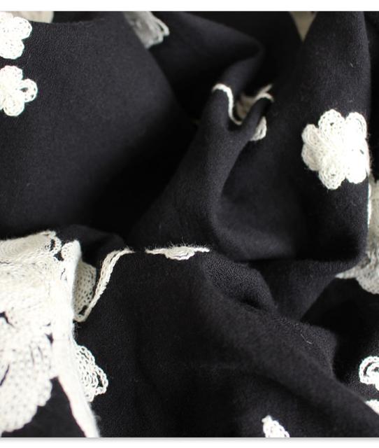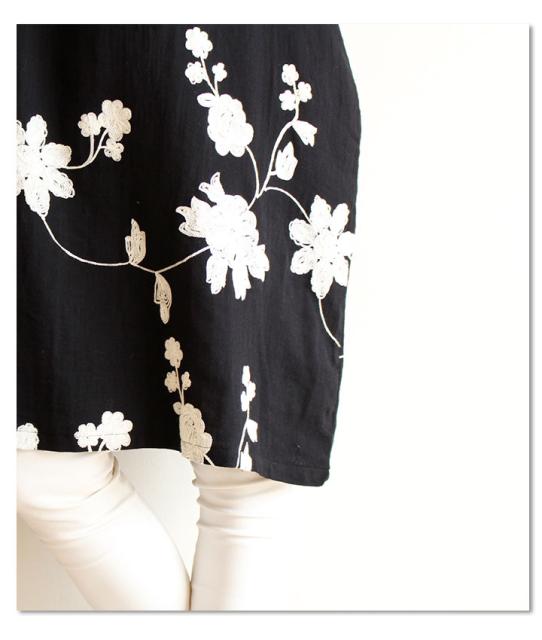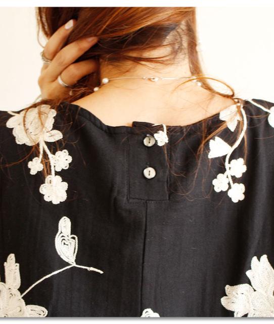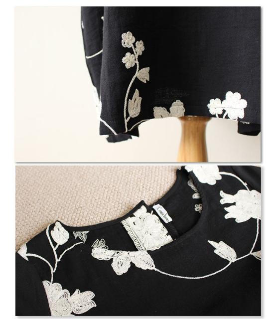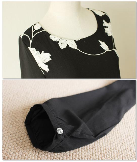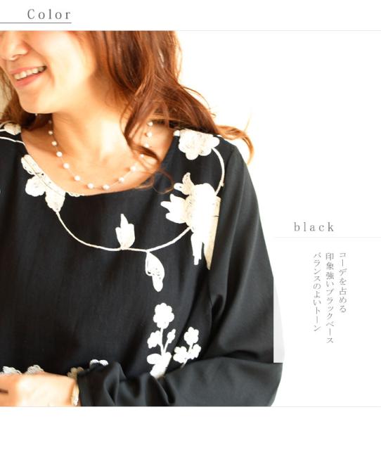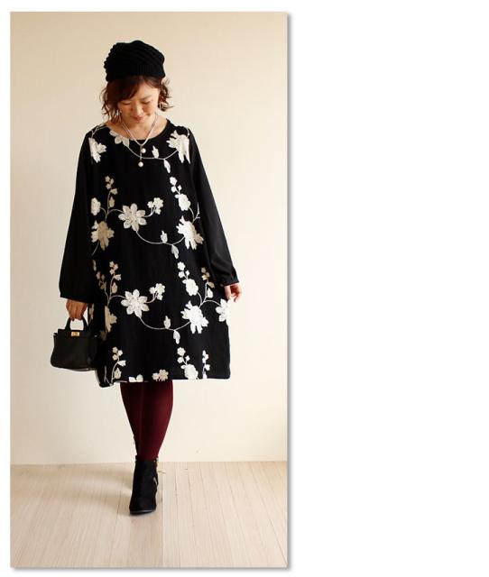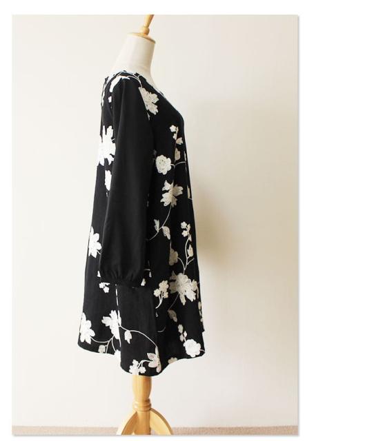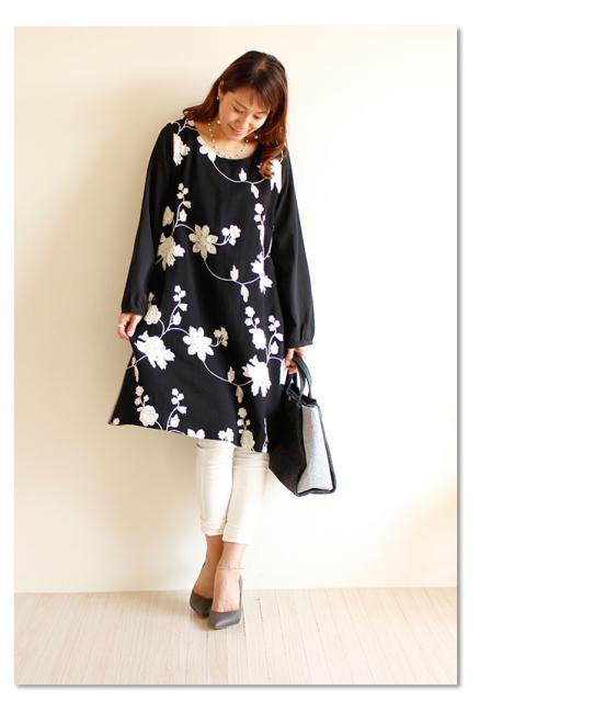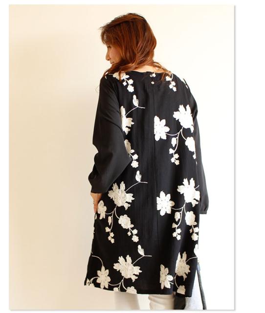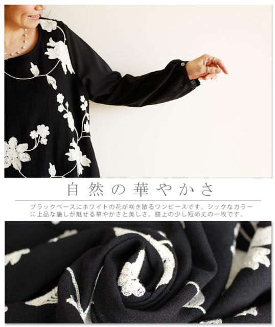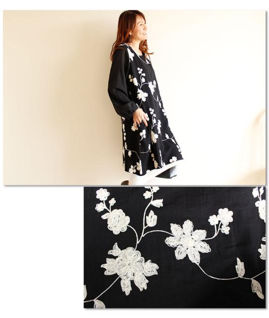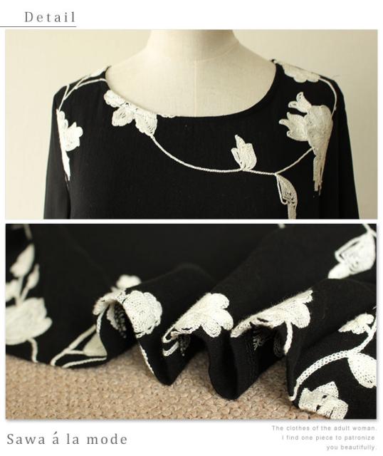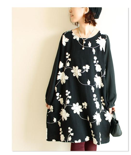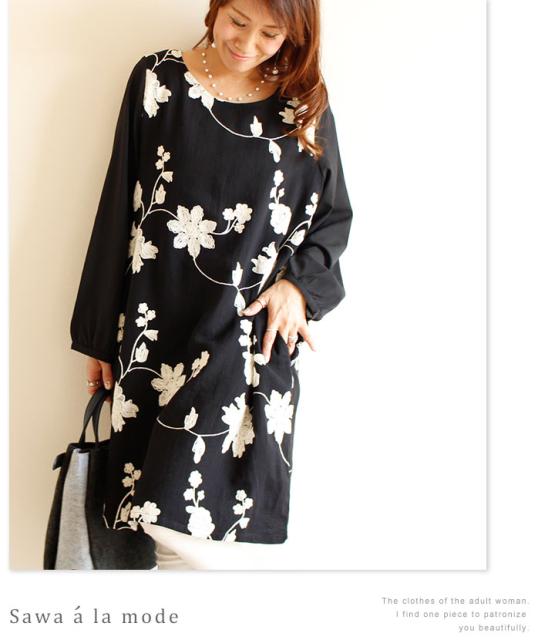 冬新作 サワアラモード ブラック レディース ファッション ワンピース チュニック 長袖 ミディアム丈 ブラック 黒 刺繍 花 花柄 シフォン 刺繍ワンピース 刺繍チュニック Uネック ラウンドネック 体型カバー ゆったり 50代 60代 mori モリガール otona cawaii mode-1430