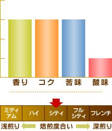 大粒のブラジルNo.2をベースに、味わいのバランスが取れたコロンビア・スプレモ、アクセントとしてグァテマラを使用することで奥行のある味わい深さをお楽しみ頂けます。喫茶店のマスターが淹れてくれた本格派コーヒーをお求めの方にお試し頂きたい一杯です。