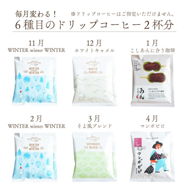 | 内容量 | ●定番ドリップコーヒー ・いつもブレンド:160g(8g×20袋) ・お茶屋が考えるまろやかブレンド :90g(9g×10袋) ・ほろにがブレンド :100g(10g×10袋) ・キリマンジャロ タンザニアAA:50g(10g×5袋) ・スマトラマンデリン:50g(10g×5袋) ●毎月変わるドリップコーヒー 【11月】WINTER winter WINTER:20g(10g×2袋) 【12月】ホワイトキャメル:20g(10g×2袋) 【1月】こしあんに合う珈琲:22g(11g×2袋) 【2月】WINTER winter WINTER:20g(10g×2袋) 【3月】そよ風ブレンド:20g(10g×2袋) 【4月】マンボビピ:20g(10g×2袋) |