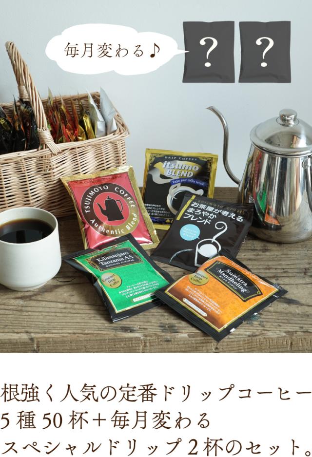 辻本珈琲の定番ドリップコーヒー5種50杯と、毎月変わるスペシャルドリップコーヒー2杯をセットにした、6種52杯分を送料無料にてお届けいたします。