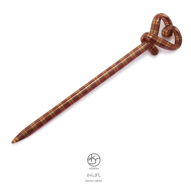 カジュアルなデザインのひねり簪です。タータンチェックのデザインを透明感のある艶やかな素材でコーティング、ハート型にひねったカワイイ簪です。浴衣や夏着物など、暖かい季節の和装には特におすすめです。また和装に限らず普段使いもしていただけます。こだわりの髪飾りを一つ加えていただくだけで、コーディネートにおしゃれ感と個性を引き立たせます。