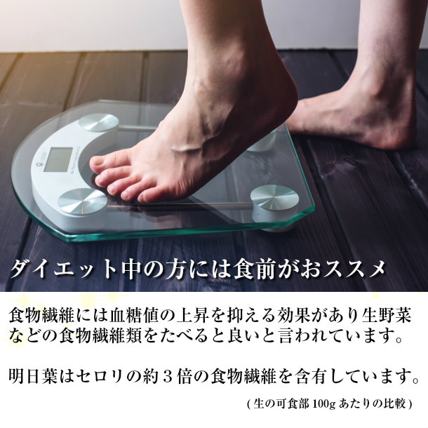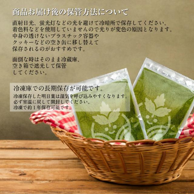 ■明日葉はカリウムを多く含む高食物繊維の食材です。お召上がりの量によってはトイレの回数が増えるなど個人差がございますので体調にあった量を調整してお召上がりください。