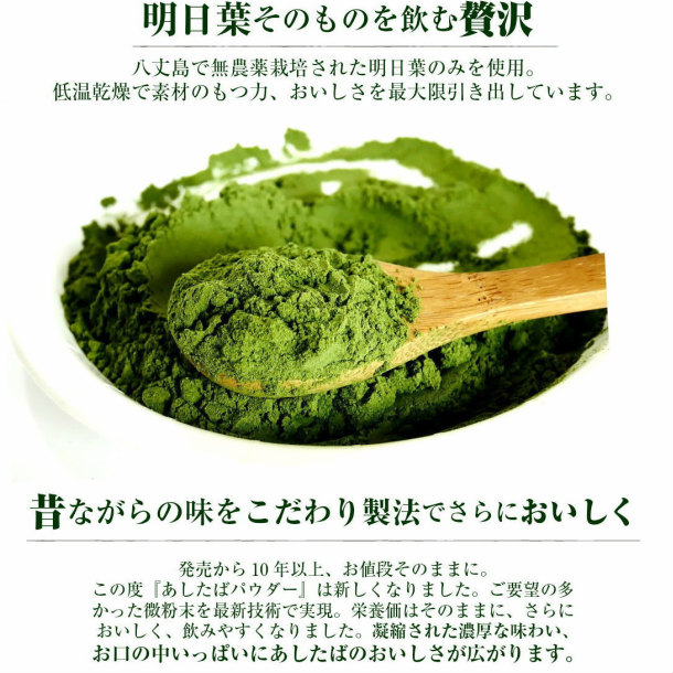 | 商品名 | 八丈島産明日葉パウダー 名称:明日葉乾燥粉末加工食品 |