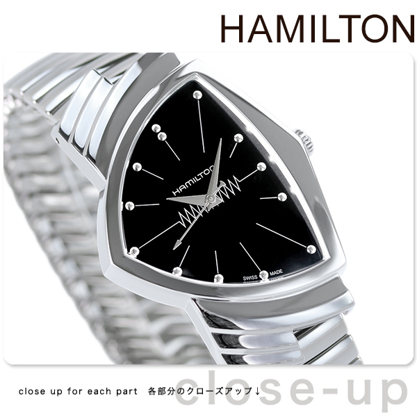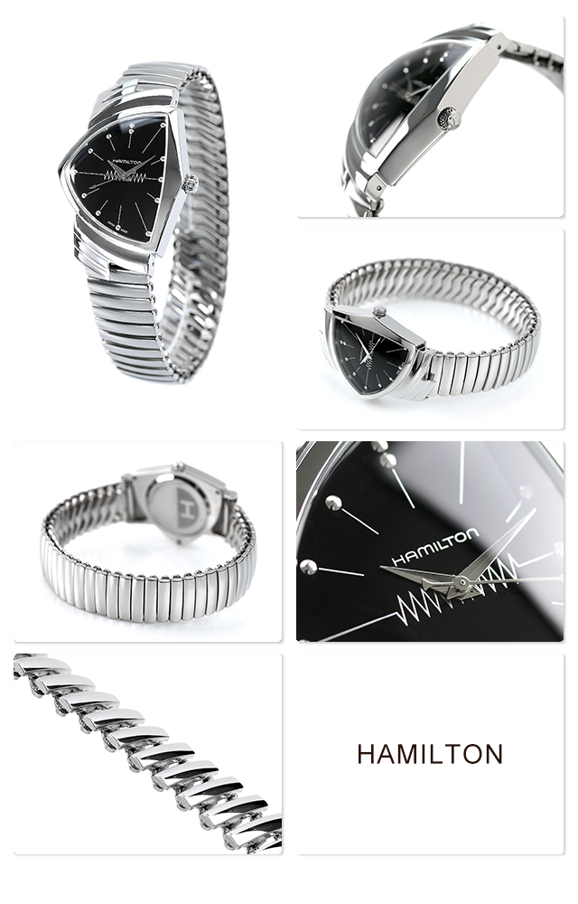 3年保証キャンペーン ハミルトン ベンチュラ フレックスブレスレットモデル 32.5mm スイス製 蛇腹 クオーツ メンズ 腕時計 H24411232 HAMILTON VENTURA アナログ ブラック ◆HAMILTON(ハミルトン)はアメリカ発祥の老舗ブランドです。創業翌年に誕生した懐中時計「ブロードウェイ・リミテッド」は、他の時計よりも正確に時を刻むことから鉄道用時計として採用されました。その後も航空用時計や軍用時計として採用されるなど、品質の高さと流行にながされない独自のデザインが世界中の人々に支持されています。 時計史上の革命児「ベンチュラ」。常識とかけ離れた左右非対称のフォルムは、保守的なデザインが主流であった時計業界に波紋を投げかけ、デザインウォッチの先駆けとして後世に大きな影響を及ぼしました。型破りなロックスピリットの象徴、フレックスブレスレットモデル。斬新で新鮮に映るデザインが特徴です。