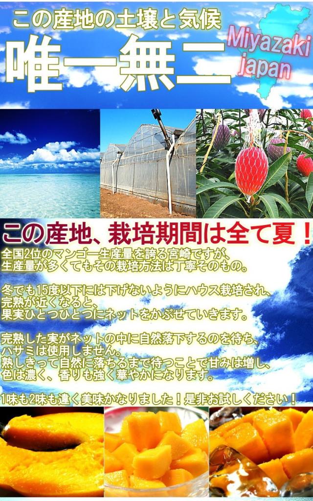 マンゴーの栽培に適した暖かな気候と日射量の多さに加え、日本で初めて「ネット収穫法」による完熟マンゴーの栽培に成功したのがこの宮崎県であり、培われた高い技術で味・香り共に優秀なマンゴーの栽培が行われています。