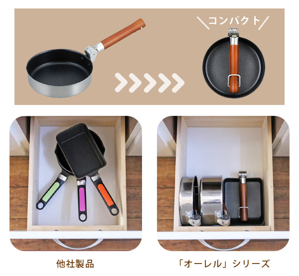 カチっと簡単に取っ手を折りたためるフライパンです。使わない時はコンパクトになり、引き出しや食器棚にも場所を取らずに収納できます。