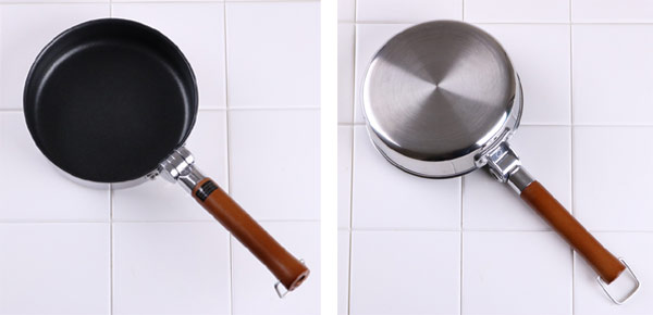 外側は丈夫なステンレス製、内側は熱伝導の良いアルミの二層鋼です。内面は2種類のマーブルを使用し、こびりつきにくさと耐摩耗性を高めた「ダブルマーブル」特殊ふっ素樹脂加工を施しています。