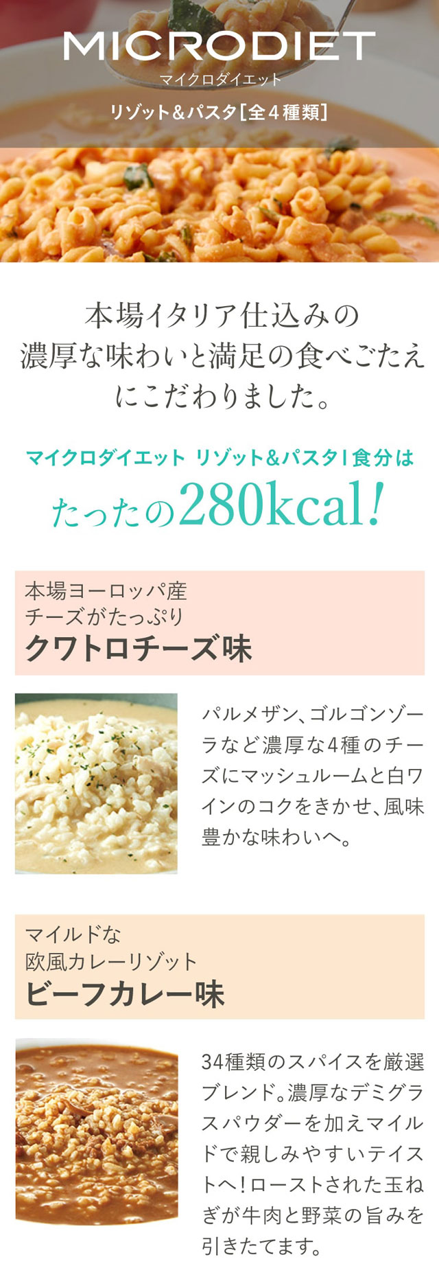 | 「マイクロダイエット パスタ」がリニューアルとなりました。(2025.11.6) 【主な変更点】 (1)使用しているパスタの変更 これまで使用していたパスタをより地球環境に優しい製法で製造されたタイプにリニューアル。 (※旧:大量のお湯を使用する製法、新:地球環境に優しいスチーム法) なお、パスタ変更に伴う、栄養成分表示、アレルギーの変更やお召し上がりの際の「作り方」に変更はございません。 (2)パスタの種類の統一 トマトパスタで使用していたペンネタイプを、よりスープが絡みやすいフジッリタイプに変更しました。 |