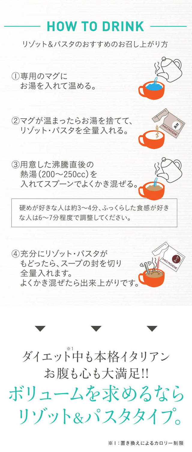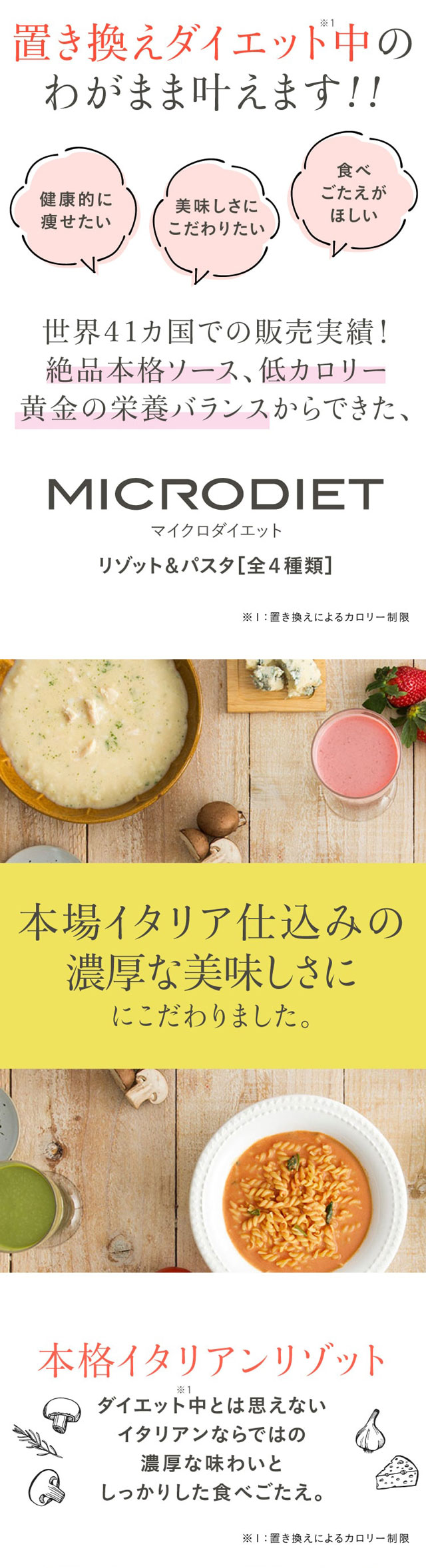 | 商品名 | マイクロダイエット リゾット&パスタ(14食) ●栄養成分/原材料につきましては、上記の商品名をタップしてご確認ください。 |