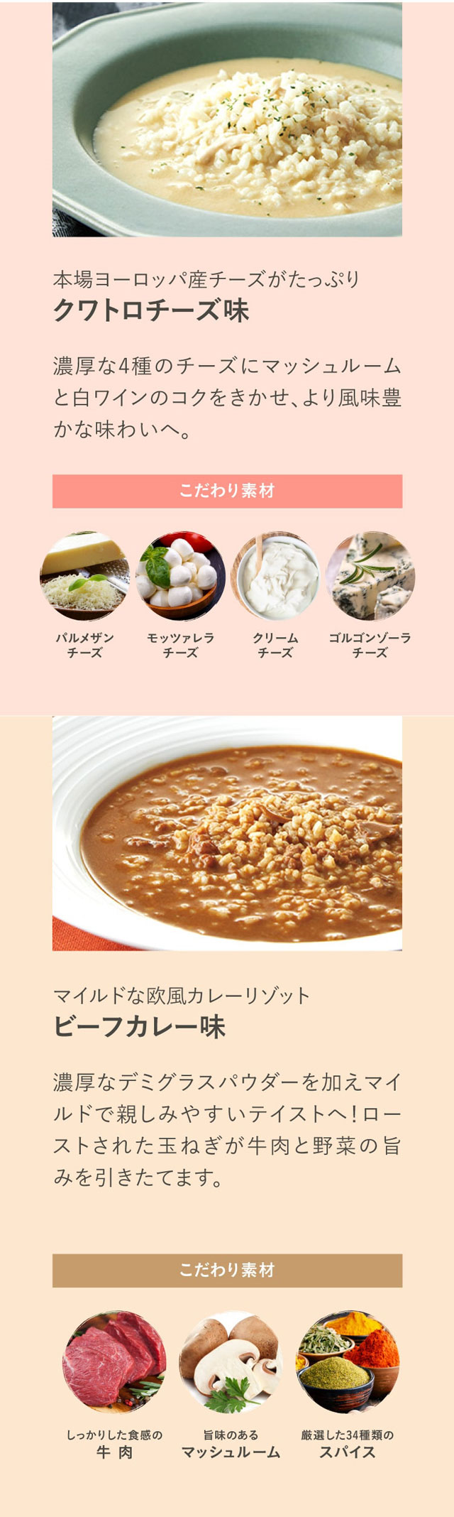 | 内容量 | ▼リゾット(クワトロチーズ):4食 ▼リゾット(ビーフカレー):3食 ▼パスタ(トマト):4食 ▼パスタ(カルボナーラ):3食 |