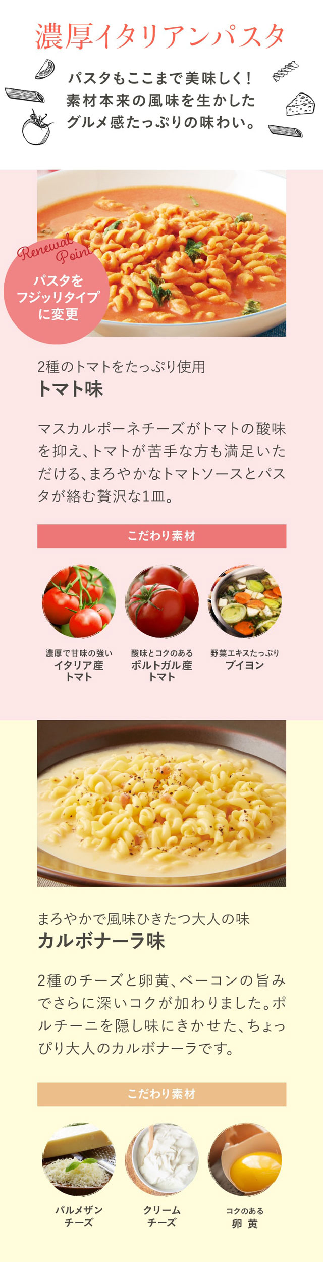 | 「マイクロダイエット パスタ」がリニューアルとなりました。(2025.11.6) 【主な変更点】 (1)使用しているパスタの変更 これまで使用していたパスタをより地球環境に優しい製法で製造されたタイプにリニューアル。 (※旧:大量のお湯を使用する製法、新:地球環境に優しいスチーム法) なお、パスタ変更に伴う、栄養成分表示、アレルギーの変更やお召し上がりの際の「作り方」に変更はございません。 (2)パスタの種類の統一 トマトパスタで使用していたペンネタイプを、よりスープが絡みやすいフジッリタイプに変更しました。 |