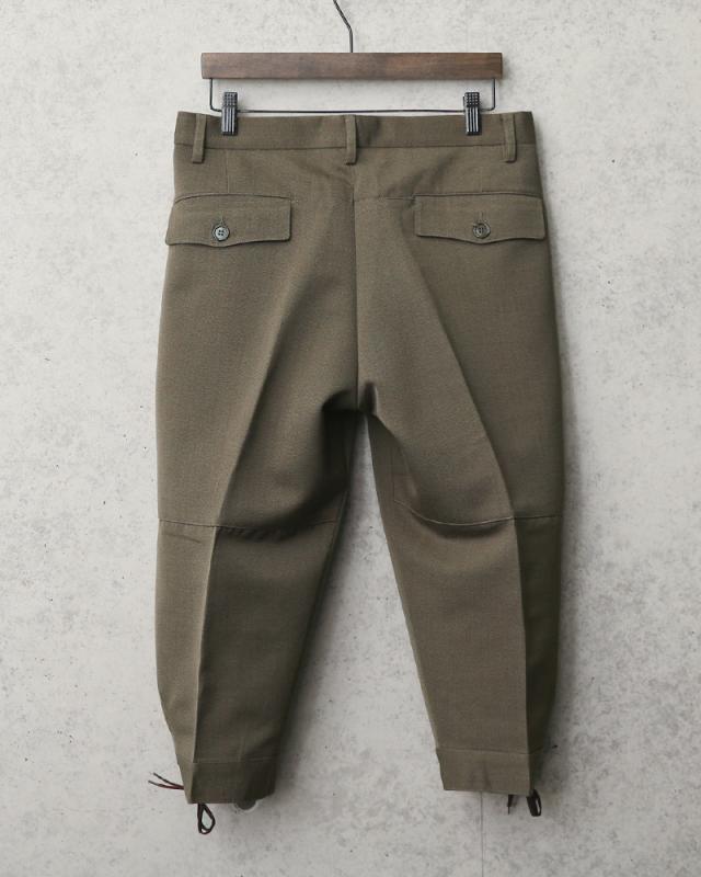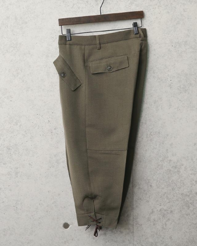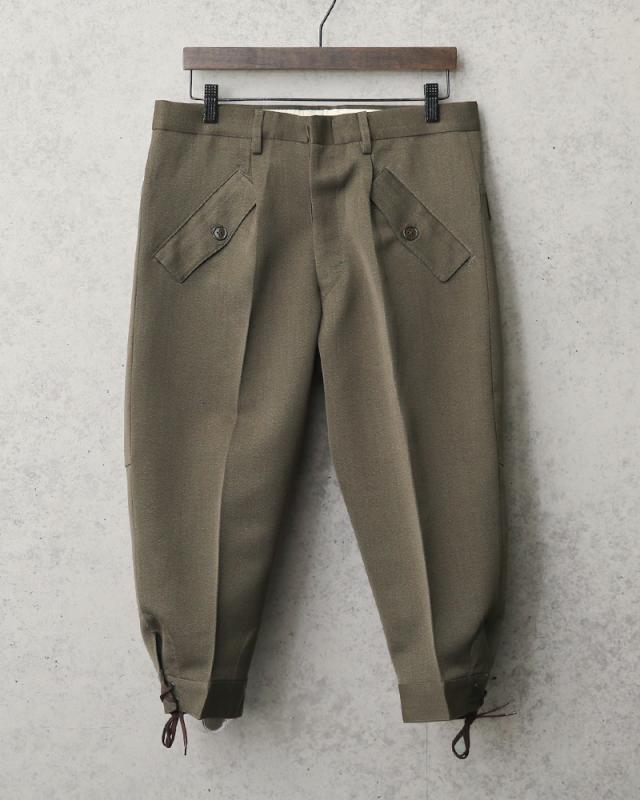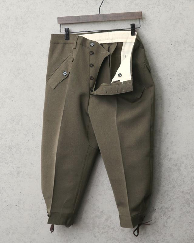 非常に希少な実物本物のイタリア軍のニッカパンツが入荷しました。ウール混のギャバジン素材で独特のごわつき感もなくとても着やすい一本です。七分丈のパンツで裾の編み上げが非常にオシャレ!ブーツ、スニーカー、サンダルと正直靴は何でも合わせやすく、シルエットもデザイン性もよく長くつきあえるパンツだと思います。