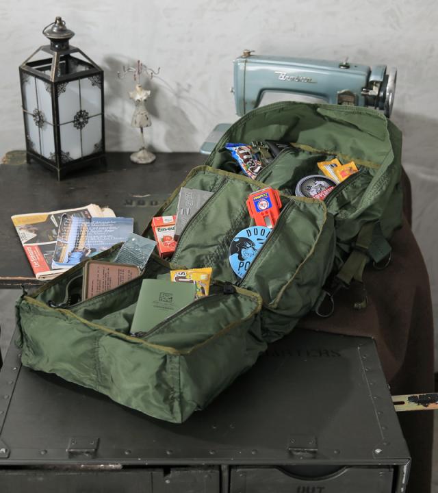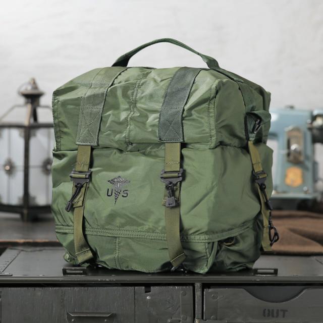 米軍実物放出のM17 メディックパックと呼ばれている衛生兵(メディック)用のメディカルバッグです。衛生兵(メディック)用としての目的に特化していますので独特の機能美があります。 医療チームの「ケリュケイオン」のシンボルマークや背面側の刻印など、ミリタリーらしいディティールも魅力です。メディカルバッグでおなじみの展開式、三段により小分けされていて、金属のフックを解放すると、ポーチ部が自重作用により、全てのジップが見えるような位置で展開。滅多に出てこないコレクターズアイテムです。