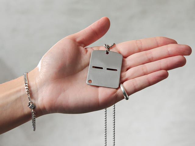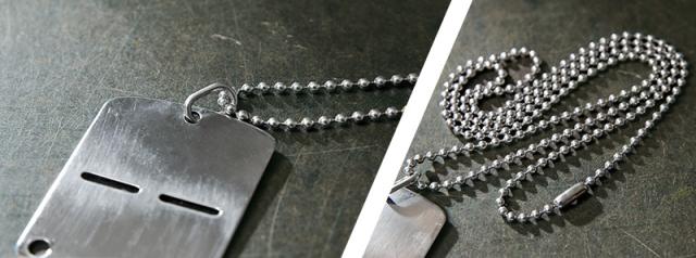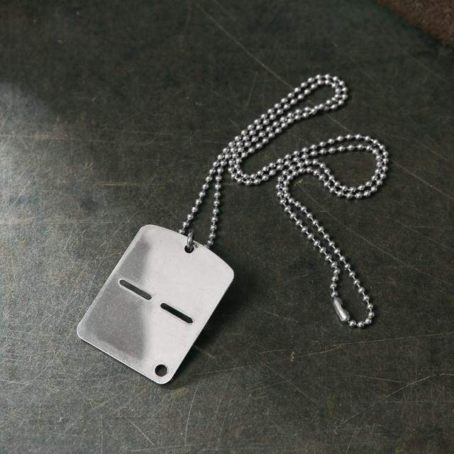 米軍のドッグタグが二枚一組に対し、イタリア軍のドッグタグは一枚のステンレス製のプレートになっています。本来の用途は一枚のプレートの上下双方に、同じ内容を打刻し、戦場において戦死した際に半分に折った一方を戦死報告用に回収し、残りを遺体の判別用に残すという使い方をします。その為、下半分にもチェーンに通すための穴が空いています。米軍のものとは一味違ったデザインで、アクセサリーとしても目を惹くおすすめのアイテムです。
