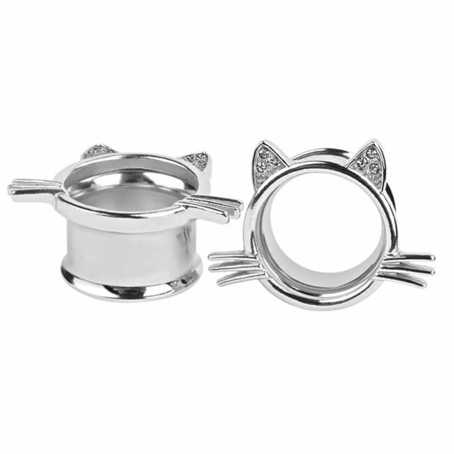 ダブルフレア型のボディピアスに猫の耳と髭をデザインした可愛いイヤレット。猫の耳にセットしたクリスタルのジルコニアがキラキラ輝くレディース人気のボディピアス。耳に着けると耳にまるで猫がいるように見える立体的なボディーピアス。女の子にも可愛いホール系ピアスのテーマで製作された大人可愛いキャットピアス。プレゼントにも最適です。0ゲージ(0G)、00ゲージ(00G)、12mm(1/2インチ)から通販できます。