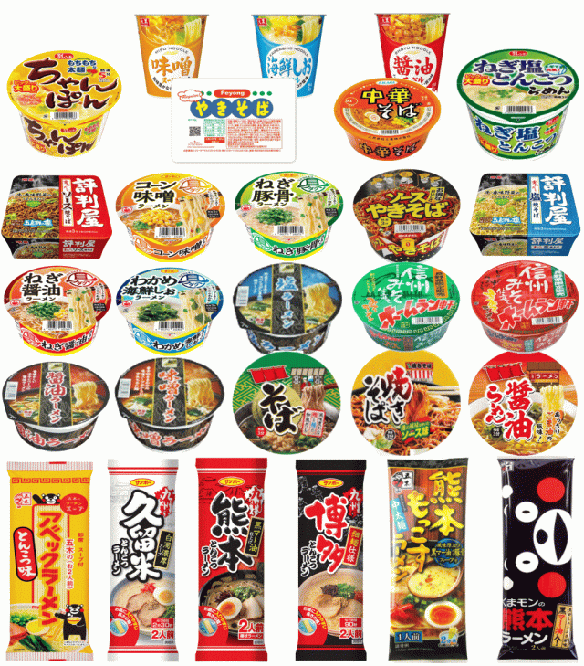 棒ラーメン6袋(1袋2人前)+レギュラーから大盛までのカップ麺(そば・うどん・焼きそば含む)22個。合計34食分になります。