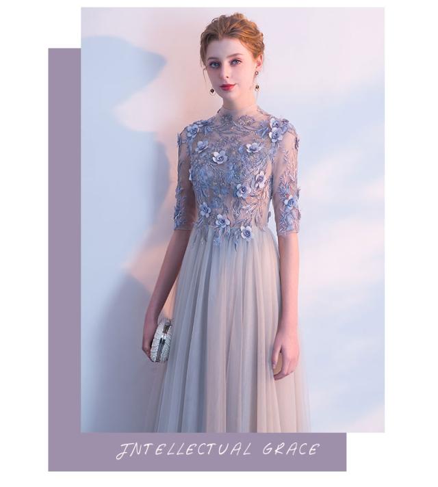 復古調 パーティドレス ロングドレス ワンピース ナイトドレス チュールスカート 5分袖 グレー 結婚式 二次会 発表会 演奏会 D129