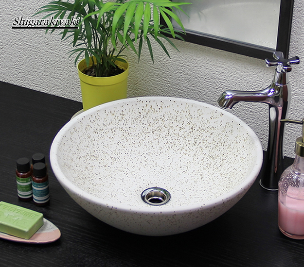 ◆信楽焼手洗器◆【品番】tr-2206【品名】信楽焼き白斑点(小型)手洗い鉢【サイズ】W350×H110ミリ手作りの為多少の誤差があります。【排水金具】サンエー水栓PH-31-25をセットした状態でお届けします。【送料】北海道、沖縄、離島以外の地域は無料です。北海道、沖縄、離島は800円掛かります。◎洗面台に信楽焼きの土のぬくもりを感じてみませんか。機能性と空間のことを考えた土もの陶器洗面ボールです。当店の洗面ボウルは和洋問わず旅館、ホテル、飲食店などの店舗様、そして最近では個人様宅で多数ご使用頂いております。