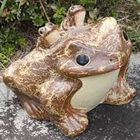 縁起物の信楽焼のカエル。人の心癒してくれる陶器の蛙です。