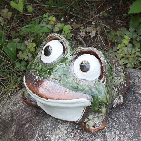 縁起物の信楽焼のカエル。人の心癒してくれる陶器の蛙です。