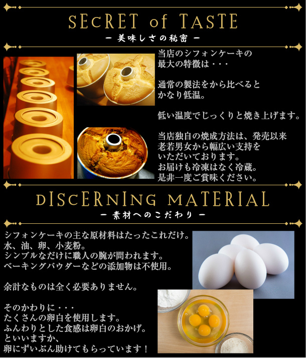 甘さ控えめでクリームなしでもおいしくいただけます。 当店のシフォンケーキはすべて20センチ型で焼き上げ、直径約18センチ高さ8.5センチのラージサイズ。 お客様からは「大きさにビックリ!」とのお声をいただきます。 一般的はエムサイズのシフォンでは一番おいしいところがはっきり言って全然ありません。 シフォンケーキのうまい部分がたくさんあるのはやっぱりラージサイズのシフォンなんです! フワフワ部分がたっぷり ギュギュッと詰まったシフォンを是非ご賞味ください。 |