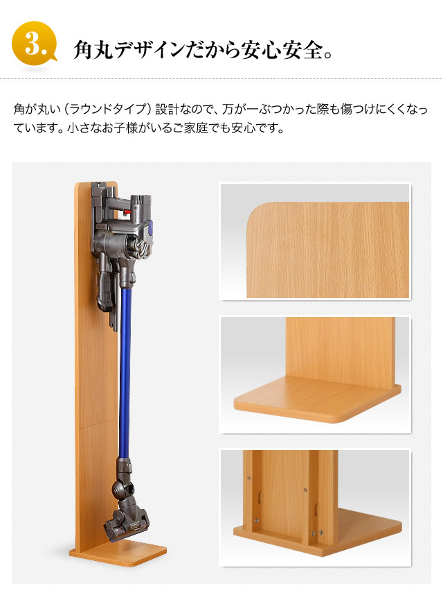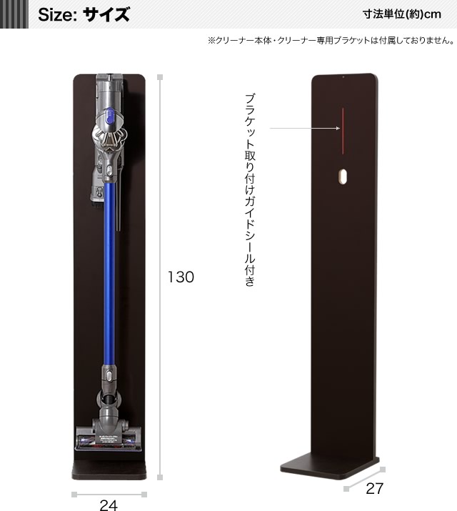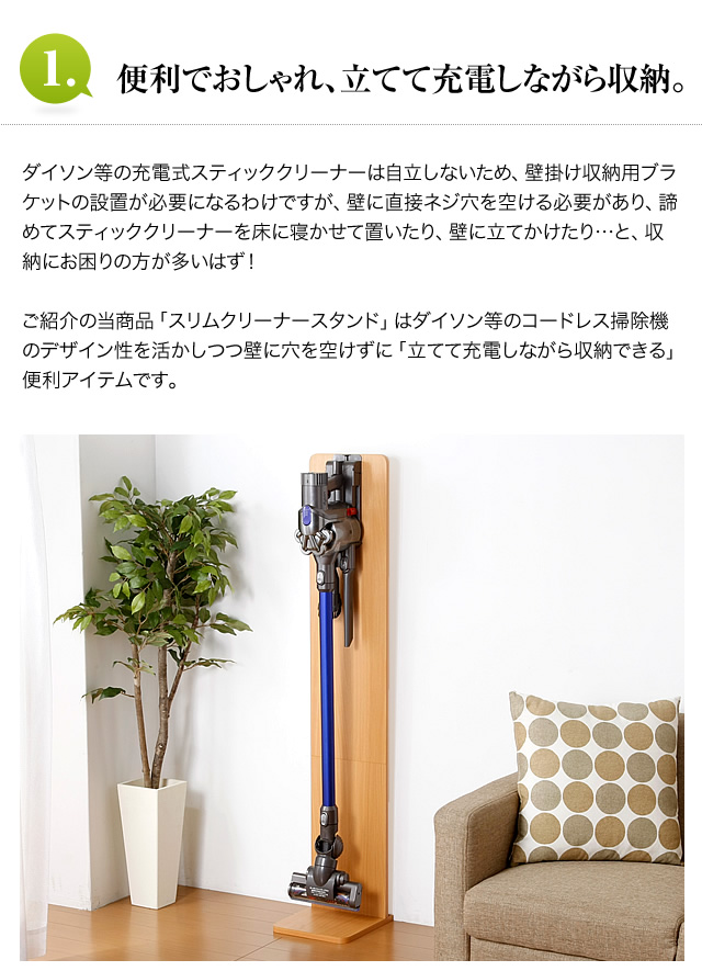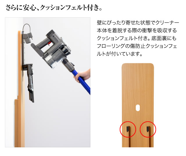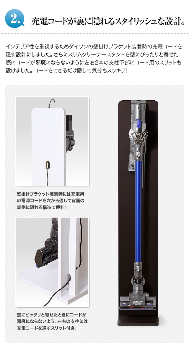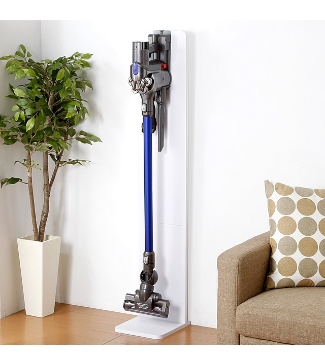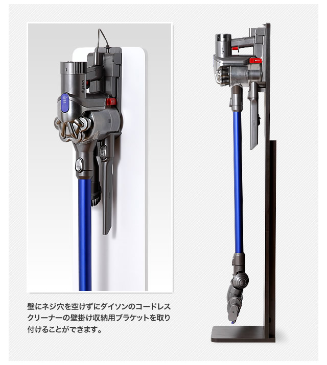 ダイソンのコードレス掃除機を「立てて充電しながら収納できる」スリムタイプのクリーナースタンド。お客様の声にお応えし、無駄な機能を省いたシンプルなデザインに。インテリアに溶け込む邪魔にならないサイズにシェイプアップ。壁に穴を空けネジ止めしなければ使えないダイソン付属の収納用ブラケットを壁を傷つけずに使用できます。ダイソンコードレスクリーナーV8シリーズ、マキタ製コードレスクリーナーにも対応。